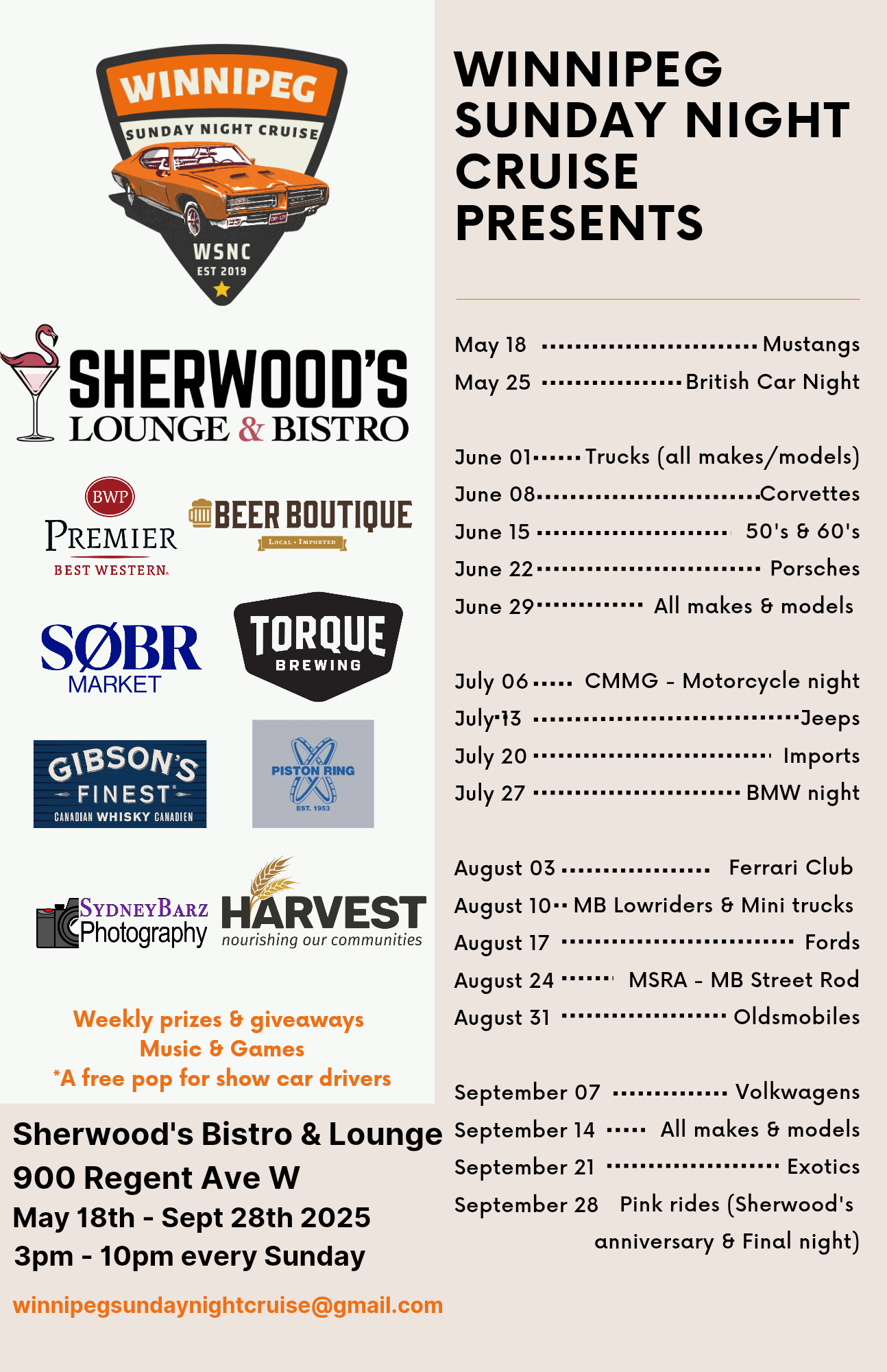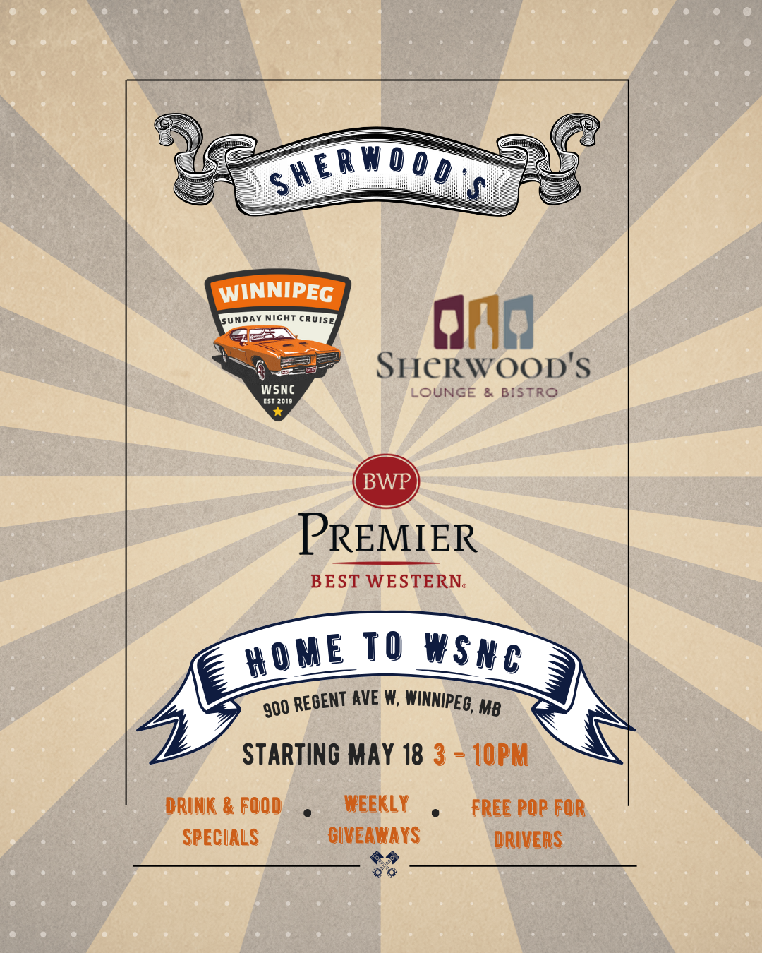 Starting May 18th 2025, Sherwood’s Lounge & Bistro at the Best Western Premier Hotel located at 900 Regent Ave West will host our famous Winnipeg Sunday Night Car Meetup.