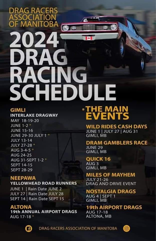 Gimli raceway GimliNostalgia Drag Racing: Interlake Dragway (Gimli MB) Aug 4 and Sept 1 OLD SCHOOL STYLE 1971 AND OLDER CARS, TRUCKS AND BIKES WELCOME TO MAKE 3 PASSES ON THE SUNDAY. […]